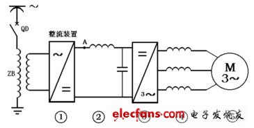機(jī)車在工作時(shí),受電弓將網(wǎng)壓引入機(jī)車變壓器一次側(cè)繞組,經(jīng)變壓器二次側(cè)繞組降壓后送入①環(huán)節(jié),將交流電轉(zhuǎn)換為脈動(dòng)直流電,經(jīng)②環(huán)節(jié)平滑A處的脈動(dòng),送入③環(huán)節(jié),將直流電逆變?yōu)殡妷汉皖l率可調(diào)的三相交流電,經(jīng)④環(huán)節(jié)平波電抗器,供給⑤環(huán)節(jié)三相異步牽引電動(dòng)機(jī),實(shí)現(xiàn)牽引運(yùn)行。在這個(gè)系統(tǒng)中,機(jī)車先將電網(wǎng)的交流能量轉(zhuǎn)換為直流能量,然后進(jìn)一步轉(zhuǎn)換成電壓和頻率可調(diào)的交流能量。各環(huán)節(jié)的作用分述如下: