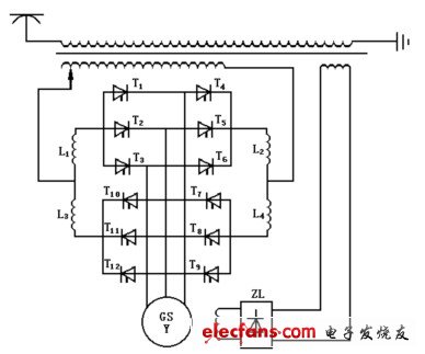 變頻變流裝置利用兩組反并聯(lián)整流橋中可控制的觸發(fā)電路,按一定相序使同步電機(jī)三相繞組依次通電,從而使電機(jī)的定子獲得旋轉(zhuǎn)磁場(chǎng)。改變變頻變流裝置的輸出電壓和頻率可以調(diào)節(jié)機(jī)車速度。同時(shí)調(diào)節(jié)同步電機(jī)的勵(lì)磁電流也可實(shí)現(xiàn)機(jī)車調(diào)速。