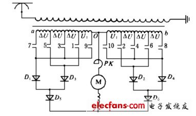 過渡到第三電壓級(jí)時(shí),ao臂保持不變,bo臂先使觸頭4閉合,再打開觸頭2,于是bo臂輸出電壓也提高到U1+△U,經(jīng)整流裝置D5、D6整流后,輸出平均電壓又有所提高。以此類推,隨著變壓器二次側(cè)ao臂、bo臂接入抽頭的不同,變壓器二次側(cè)的輸出電壓也不同,因而達(dá)到調(diào)節(jié)輸出電壓的目的。