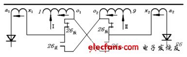 變壓器二次側(cè)繞組的一臂分成a1x1和1o1兩部分,另一臂分成a2x2、9o2兩部分。a1x1、a2x2為基本繞組,1o1、9o2為可調(diào)繞組?;纠@組部分的電壓比可調(diào)繞組的電壓略高。26為繞組轉(zhuǎn)換開關(guān),它由26反和26正兩組開關(guān)組成。