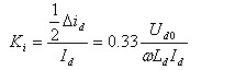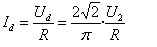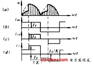 整流電流平均值Id由歐姆定律確定,電流波形因平波電抗器Ld很大而呈一條直線,變壓器繞組中電流波形為方波,電流有效值為:
