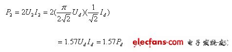 變壓器二次側(cè)繞組中交替流過(guò)整流電流Id,所以變壓器二次側(cè)繞組電流有效值I2為: