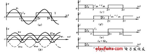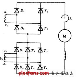 為了改善機(jī)車的功率因數(shù),降低諧波干擾,機(jī)車上廣泛應(yīng)用多段整流橋順序控制,即把橋段數(shù)增加到n段,n愈大,則效果愈好。下面就分別介紹理想情況下半控二段橋、三段不等分橋,四段經(jīng)濟(jì)橋的工作原理。