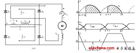 時(shí),將進(jìn)行有源逆變。所以采用再生制動(dòng)的電力機(jī)車,整流電路必須選擇全控橋,而對(duì)于沒(méi)有采用再生制動(dòng)的電力機(jī)車則均采用半控橋。這是因?yàn)榘肟貥蛞葡喾秶热貥虼?0~π),機(jī)車功率因數(shù)平均值高,而且半控橋比全控橋控制簡(jiǎn)單。
