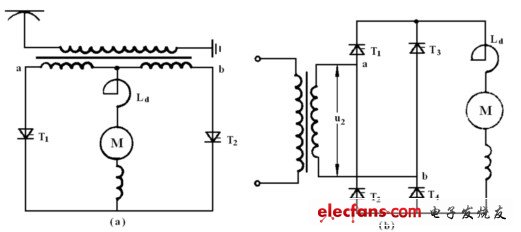 有級(jí)調(diào)速的電力機(jī)車采用不控整流電路,如SS1型電力機(jī)車。根據(jù)整流元件與變壓器繞組連接方式的不同,分為中點(diǎn)抽頭式(簡(jiǎn)稱中抽式)和橋式整流電路兩種。
