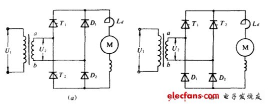 圖2-22給出了兩種接法的半控橋式整流電路,圖(a)為不共陰極整流電路接法,圖(b)為共陰極整流電路接法。其中,不共陰極半控橋式整流電路在電力機(jī)車上被廣泛采用。