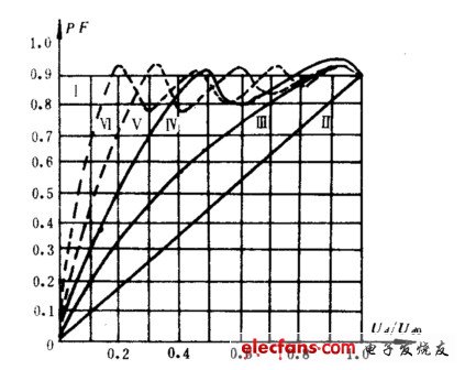 我們將功率因數(shù)表達(dá)式中控制角α用Ud公式表示,則可表示為 的函數(shù)關(guān)系。根據(jù)式(2-33)、式(2-52)、式(2-54)可求出各種整流電路不同控制角α時(shí)的 值。繪出PF=f(Ud/Ud0)曲線如圖2-24所示,Ⅰ為不控整流電路的功率因數(shù)曲線。Ⅱ?yàn)槿貥蚴秸麟娐饭β室驍?shù)曲線,由曲線可知,在低電壓時(shí)功率因數(shù)是很低的。Ⅲ為半控橋式整流電路功率因數(shù)曲線,它位于Ⅰ、Ⅱ之間,顯然半控橋整流電路的功率因數(shù)平均值有所提高。