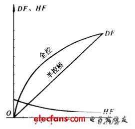 圖2-25表示相位移系數(shù)DF、諧波系數(shù)HF與輸出電壓級(jí)位之間的變化關(guān)系。由HF曲線可知,對(duì)于半控橋整流電路當(dāng)控制角α較小(即電壓級(jí)位低)時(shí),諧波系數(shù)HF將增加,這說(shuō)明電流畸變?cè)龃蟆?/p>