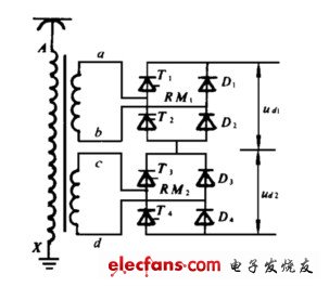 機(jī)車整流裝置一般采用中抽式和橋式兩種整流電路。從整流電路的參數(shù)計(jì)算中我們知道,橋式整流電路變壓器的利用率較中抽式整流電路變壓器的利用率高20%,故電力機(jī)車上一般選用橋式整流裝置。