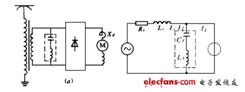 功率因數(shù)補(bǔ)償裝置兼作濾波器,簡(jiǎn)稱PFC裝置,一般常用形式為L(zhǎng)C、RC、RLC,并跨接于機(jī)車主變壓器二次側(cè)繞組的兩端,如圖2-30所示。其工作原理可用圖2-31說(shuō)明:在理想情況下,由于整流電路的作用,整流裝置交流側(cè)電流I2為一方波,造成接觸網(wǎng)中電流波形發(fā)生畸變,即產(chǎn)生高次諧波電流,從iT表達(dá)式中我們知道,諧波電流主要是3、5、7次含量。而整流裝置的負(fù)載--平波電抗器和牽引電動(dòng)機(jī)均為感性負(fù)載,加之整流裝置本身的晶閘管相位控制(α)的作用,使電流I2的相位滯后于電網(wǎng)電壓UC,也即產(chǎn)生了一個(gè)感性無(wú)功電流,使機(jī)車功率因數(shù)降低。加上功補(bǔ)裝置后,就是把L、R、C連接成某一頻率的諧振電路(一般在靠近三次或五次諧波頻率處)。在基波網(wǎng)壓的作用下對(duì)基波呈容性,提供容性無(wú)功電流,減少相控整流機(jī)車滯后的負(fù)載電流,從而提高了功率因數(shù);同時(shí)對(duì)3、5次諧波呈低阻性,使通過(guò)功補(bǔ)裝置的3次、5次諧波電流增大而被吸收掉,減少了流向電網(wǎng)的3次或5次諧波電流,也減少了等效干擾電流。