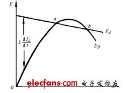 圖3-17作出了逆變裝置的外特性和串勵(lì)發(fā)電機(jī)的外特性曲線,兩曲線交于(a、b)兩點(diǎn)。在a點(diǎn)上是不能保證再生制動(dòng)穩(wěn)定工作的,因?yàn)樵赼點(diǎn)進(jìn)行再生制動(dòng)時(shí),若由于某種原因使制動(dòng)電流Iz瞬間增大時(shí),UD>Ud,在電路自感電勢(shì)