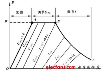 (1)調(diào)節(jié)勵(lì)磁電流IL。機(jī)車在高速時(shí)進(jìn)行再生制動(dòng),為了提高功率因數(shù),可維持逆變器電壓Udα為最大,且基本為恒定。通過調(diào)節(jié)勵(lì)磁電流來調(diào)節(jié)制動(dòng)電流,如圖3-21中BC段,隨著機(jī)車運(yùn)行速度V的下降,相應(yīng)增加勵(lì)磁電流,直至額定值為止。勵(lì)磁電流最小值受電機(jī)安全換向限制。勵(lì)磁調(diào)節(jié)的優(yōu)點(diǎn)是調(diào)節(jié)功率小,調(diào)節(jié)平滑,缺點(diǎn)是機(jī)車速度的下限受到磁飽和的限制,高速時(shí)受電機(jī)安全換向的限制。制動(dòng)力受制動(dòng)功率的限制,隨著機(jī)車速度增加,制動(dòng)力要相應(yīng)減小。
