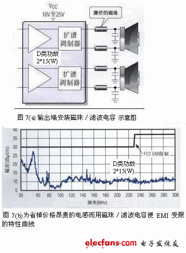 4 本文僅對(duì)便攜式設(shè)備中現(xiàn)在D類(lèi)放大器應(yīng)用反饋技術(shù)、擴(kuò)譜調(diào)制技術(shù)以降低電源電磁干擾技術(shù)(EMI)方案及其新一代無(wú)濾波器D類(lèi)放大器作分析說(shuō)明。并在文章開(kāi)始對(duì)便攜式設(shè)備內(nèi)部和外部產(chǎn)生的EMI(電磁干擾技術(shù))與影響作了說(shuō)明。