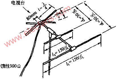 X型兩頻道電視接收天線的外形及尺寸見(jiàn)下圖?,F(xiàn)以二、八頻道為例,介紹一下各振子及相互距離的計(jì)算方法和安裝制作。