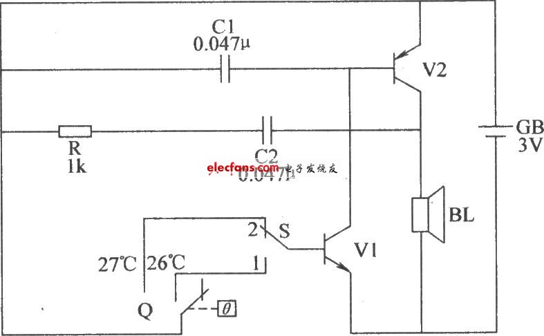 該水稻育苗床高溫報(bào)警器電路由電熱點(diǎn)溫度計(jì)Q、轉(zhuǎn)換開關(guān)S、晶體管V1、V2、電阻器R、電容器C1、C2、揚(yáng)聲器BL和電池GB組成(V1、V2和C1、C2、R、BL組成互補(bǔ)式振蕩器電路),如圖所示。