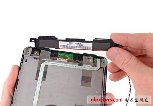 Kindle Fire只在底部設(shè)置了一個電源按鍵,其電路模塊同樣使用螺絲固定,解除方便,而揚聲器設(shè)置在了機身上部,同樣拆解輕松。