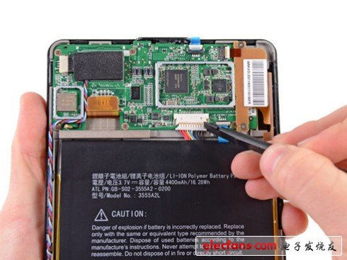 在拔掉主板上電池連接線,可以將粘在機器上的電池拿下來,這是一塊4.6英寸長、4.3英寸寬的鋰離子電池,容量為4400mAh,電池電壓3.7V。充滿電后可提供8小時續(xù)航。雖說在電池上方大家可看到中文介紹,但目前Kindle Fire還并未在國內(nèi)上市,至于原因,應(yīng)該與亞馬遜營銷策略有關(guān)。