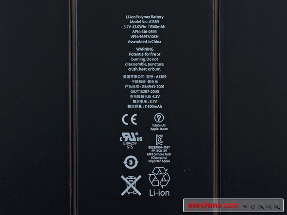 抬起LCD面板,我們最直觀地看到ipad 4的電池,它配置3.7 V, 43 Whr的電池包,和iPad 3一樣,iPad 4的電池也非常牢固地固定在后蓋上。由于電池是消耗品,容易磨損,這給iPad以及其他蘋果設(shè)備的拆解增添難度。