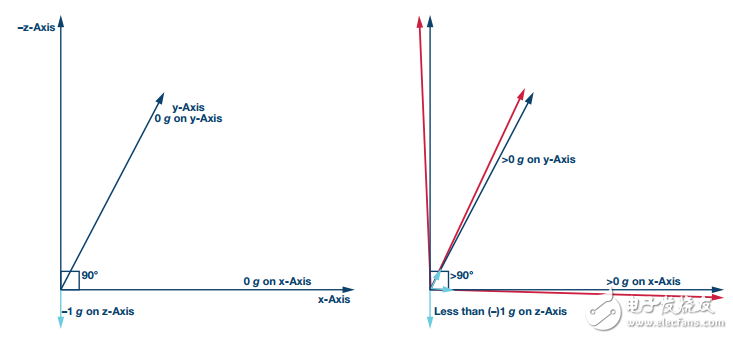 為了解正交誤差的影響,假設(shè)一個(gè)加速度計(jì)軸指向正上方,器件恰好處于水平狀態(tài)。加速度計(jì)在此z軸上測(cè)量重力的總影響。如果其他兩個(gè)軸完全正交,那么它們不會(huì)測(cè)量到任何重力矢量。然而,若有正交誤差,其他兩個(gè)水平軸就會(huì)測(cè)量到重力矢量的一部分。例如,若器件的跨軸靈敏度為1%,其對(duì)重力的等效響應(yīng)將是 10 mg,這相當(dāng)于0.6°的等效對(duì)齊誤差。反之,如果第一個(gè)軸不與水平框架正交,它便測(cè)不到完整的重力矢量。