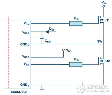 在圖5中,將ADuM7223隔離式柵極驅(qū)動器配置為自舉柵極驅(qū)動器來驅(qū)動半橋。DBST是外部自舉二極管,CBST是外部自舉電容。在低端MOSFET Q2開啟的每個周期內(nèi),VDD會通過自舉二極管為自舉電容充電。為最大限度降低功耗,需要使用正向壓降低且反向恢復(fù)時間短的超快二極管。