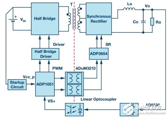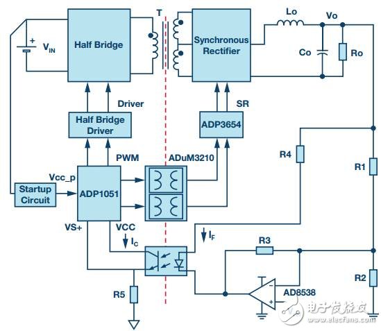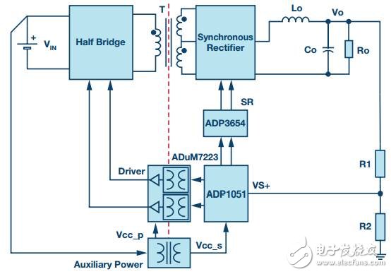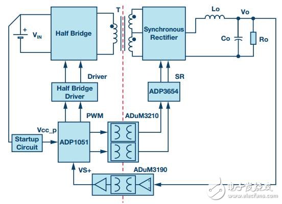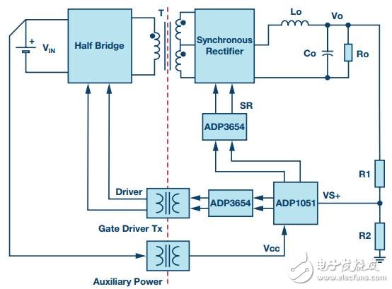 一般而言,ADP1051更常用于副邊控制,因?yàn)樗c系統(tǒng)通信非常方便。因此,同步整流器的PWM信號以及VOUT檢測等信號無需跨越隔離邊界與系統(tǒng)進(jìn)行通信。不過在這種情況下,需要輔助電源在啟動階段從原邊向副邊控制器ADP1051提供初始電力。此外,來自ADP1051的PWM信號需要跨越隔離邊界。