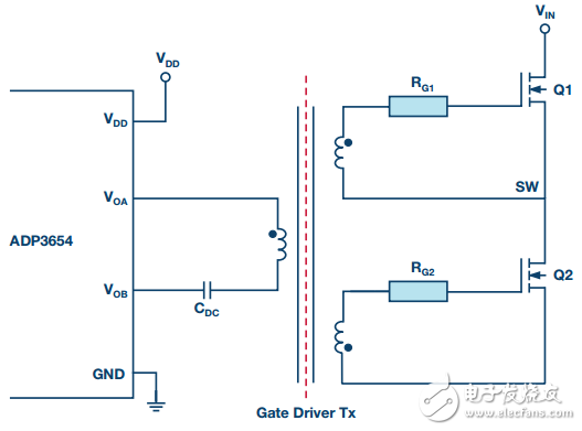 圖1. 采用ADP3654解決方案驅(qū)動?xùn)艠O驅(qū)動變壓器