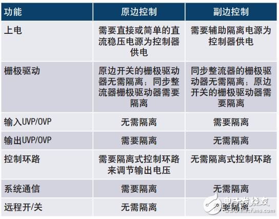根據(jù)控制器的位置,隔離電源控制方式分為原邊控制和副邊控制兩種。表1對比了原邊控制和副邊控制的功能。在下表中,UVP和OVP分別代表欠壓保護(hù)和過壓保護(hù)。