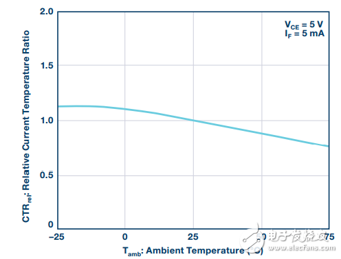 隔離數(shù)字電源中的輸出電壓通常需要快速準(zhǔn)確的隔離反饋。光耦合器經(jīng)常用于將來自副邊的模擬信號發(fā)送到原邊,但其CTR會隨著溫度而發(fā)生極大變化,且性能也會隨著時間推移而下降。圖6顯示了TCET1100的歸一化CTR與環(huán)境溫度特性。在該圖中,CTR的變化率在–25°C到+75°C的范圍內(nèi)會超過30%。