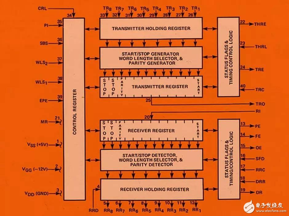 UART的發(fā)明是由于貝爾自己需要將一個(gè)電傳打印機(jī)(Teletype)連接到一個(gè)PDP-1,需要將并行信號(hào)轉(zhuǎn)換為串行信號(hào)。貝爾于是設(shè)計(jì)了一個(gè)使用大約50個(gè)獨(dú)立部件的電路。這個(gè)想法被證明是受歡迎的。當(dāng)時(shí)西部數(shù)據(jù)公司(Western Digital)是一家制造計(jì)算機(jī)芯片的小公司,它設(shè)計(jì)了單芯片版的UART。西部數(shù)據(jù)的創(chuàng)始人 Al Phillips 仍記得當(dāng)時(shí)公司的工程副總裁向他展示準(zhǔn)備制作的 Rubylith 的設(shè)計(jì)圖時(shí)的場(chǎng)景。他說(shuō):“我看了一會(huì)兒,發(fā)現(xiàn)一個(gè)斷開(kāi)的電路,副總裁都快抓狂了?!蔽鞑繑?shù)據(jù)在1971年左右發(fā)布WD1402A,其他版本也在隨后陸續(xù)發(fā)布。