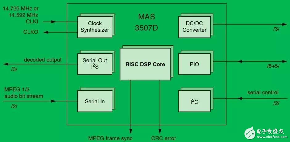 正如這個(gè) Micronas 的設(shè)計(jì)文件所顯示的,MAS3507是只為做好一件事設(shè)計(jì)的,即只能很好地解碼 MPEG Audio Layer III(即MP3)數(shù)據(jù)。