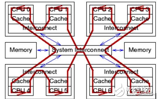 現(xiàn)代CPU的速度比現(xiàn)代內存系統(tǒng)的速度快得多。2006 年的CPU可以在每納秒內執(zhí)行十條指令。但是需要很多個十納秒才能從物理內存中取出一個數(shù)據(jù)。它們的速度差異(超過2個數(shù)量級)導致在現(xiàn)代CPU中出現(xiàn)了數(shù)兆級別的緩存。這些緩存與CPU是相關聯(lián)的,如下圖。典型的,緩存可以在幾個時鐘周期內被訪問。借助于CPU流水線的幫助,我們暫且可以認為,緩存能夠抵消內存對CPU性能的影響。