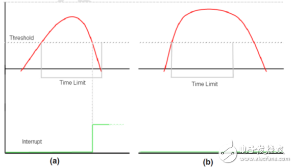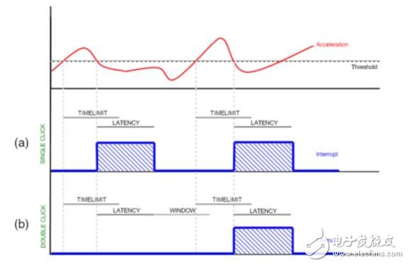 如下圖,sensor通過檢查加速度的變化是否有超出預(yù)先定義的閾值,然后在規(guī)定的時(shí)間內(nèi)(time limit)又是否小于此閾值來判斷一個(gè)single click 的動(dòng)作,閾值和時(shí)間(time limit)就定義了加速的的變化波形。下圖中,a 同時(shí)滿足了閾值和時(shí)間限制的條件,是一次成功的動(dòng)作的識(shí)別,然后產(chǎn)生了中斷。b只滿足了大于閾值的條件,但在規(guī)定時(shí)間限制內(nèi)沒有降到閾值下,所以不滿足識(shí)別的條件。