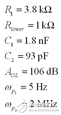 從 Mathcad? 表的計算表明,一個極點位于291千赫,而零點將位于 13.2 kHz 。根據(jù)(8),必須選擇一個 50 MHz 的 GBW 放大器。查閱各種運放的數(shù)據(jù)表,我們發(fā)現(xiàn) LT1208 具有典型的 7k 開環(huán)增益(約77dB),可降到 2k(66dB)為最小值。其典型增益帶寬積為 45 MHz ,在電源 ±5 V 時,降至34兆赫。因此,低頻極點位于34兆赫/ 7k,約4.8千赫處。