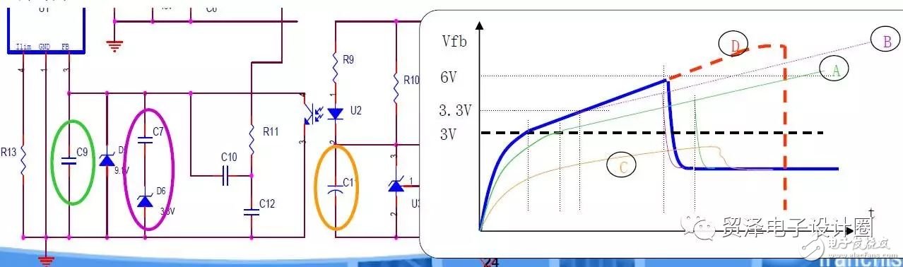 A.增大反饋電容(C9),可以將Vfb的上升斜率降低,如圖所示,由D線變成A線。但是反饋電容太大會(huì)影響正常工作狀態(tài),降低反饋速度,使輸出紋波變大。所以此電容不能變化太大。