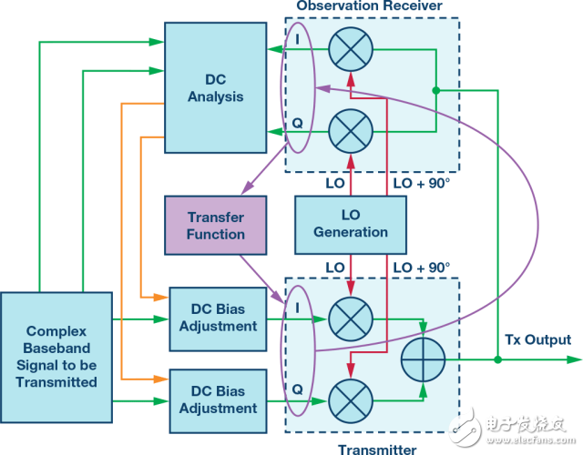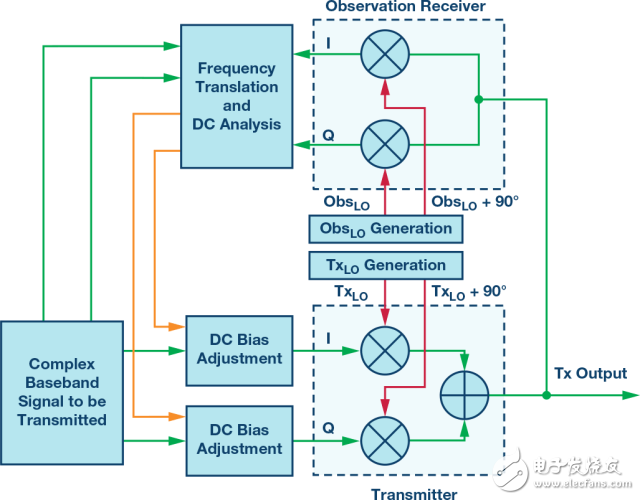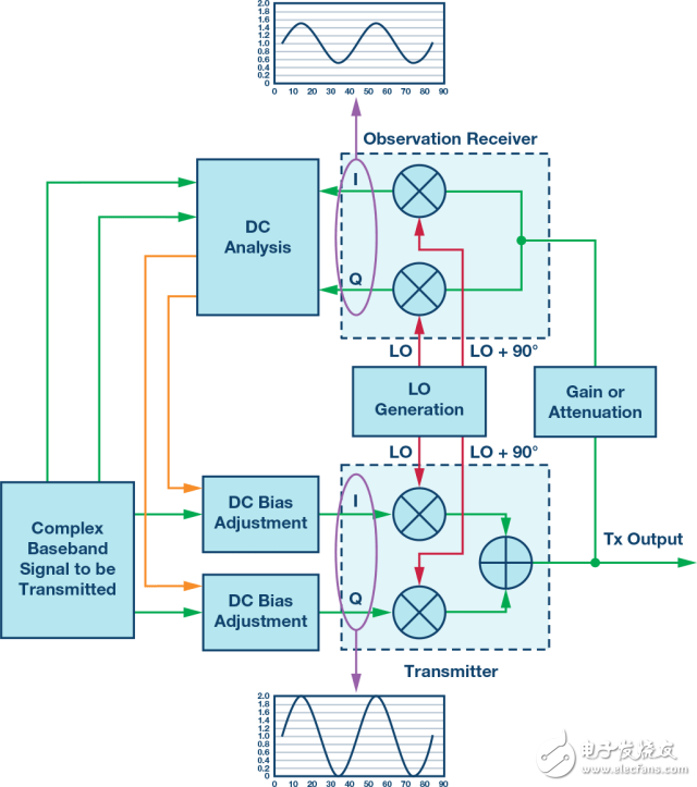 所需的發(fā)射信號將需要應用于發(fā)射器的輸入。對發(fā)射數(shù)據(jù)施加直流偏置后,混頻器的輸出端將包含所需的發(fā)射信號以及所需的LOL抵消信號。特意生成的抵消信號將與無用的LOL組合抵消,僅留下 所需的發(fā)射信號。