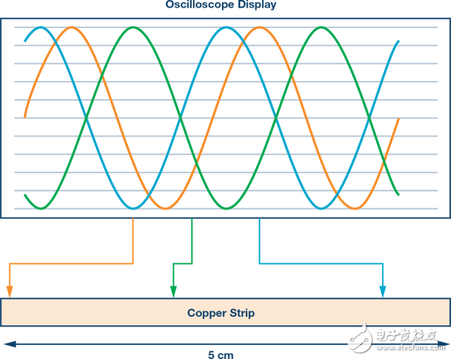 需要注意的是,沿銅帶移動單個示波器探頭將不會顯示此效應,因為示波器將始終在0°相位觸發(fā)。只有使用多個探頭才能觀測到距離與相位之間的關系。