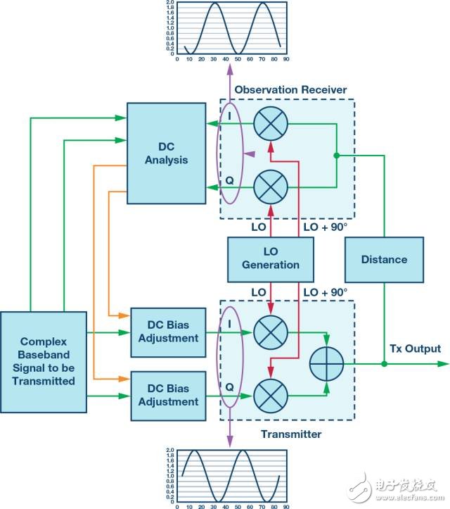 生成幅度相等但相位與LOL相反的信號即可實現(xiàn)LOL消除,從而將其抵消,如圖4所示。假設我們知道LOL的確切幅度和相位,則可以對發(fā)射器輸入施加直流失調來生成抵消信號。