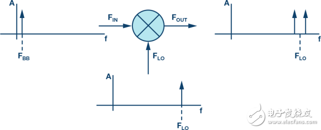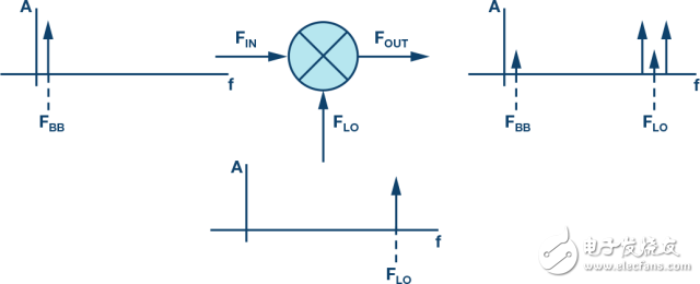 RF混頻器有兩個輸入端口和一個輸出端口,如圖1所示。理想混頻器將產生一個輸出,它是兩個輸入的乘積。就頻率而言,該輸出的頻率應當是FIN+ FLO以及FIN– FLO,不含其它項。如果任一輸入不在驅動狀態(tài)下,則不會有輸出。