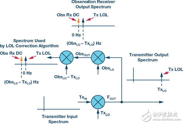 圖6所示的方法有其內在缺陷:使用相同的LO來發(fā)射和觀測,發(fā)射LOL將在觀測接收器的輸出端顯示為直流。由于電路中的元件不匹配,觀測接收器本身將具有一定量的直流,因此觀測接收器的總直流輸出將是發(fā)射鏈路中存在的發(fā)射LOL與觀測鏈路原生直流失調。有一些方法可以克服這個問題,但是更好的方法是使用不同的LO頻率進行觀測,從而將觀測路徑中的原生直流從發(fā)射LOL觀測結果中分離出來。這種情況如下面的圖7所示。