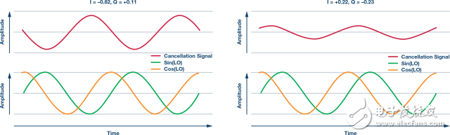 用于驅動復數(shù)混頻器的正交信號可以描述為Sin(LO)和Cos(LO) —這些是LO頻率的正交信號,可以驅動兩個混頻器。為了生成抵消信號,這些正交信號以不同的權重相加。就數(shù)學而言,我們可以產生一個輸出,即I × Sin(LO) + Q × Cos(LO)。運用不同的帶符號值代替I和Q,得到的和將是LO頻率信號,并且可以具有任何所需的幅度和相位。示例如圖5所示。