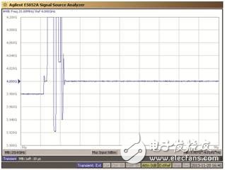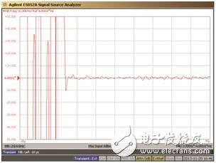 現(xiàn)在,我們來(lái)檢查一下,從 3.98GHz 到 4.00GHz 階躍 20MHz 之后,LTC6946 的輸出穩(wěn)定到與最終頻率值相差 10kHz 以內(nèi)有多快。E5052A 可捕捉瞬態(tài)響應(yīng),如圖 3 所示。