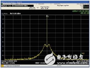我們已經(jīng)評(píng)估了我們的快速穩(wěn)定合成器的相位噪聲行為。然而,考慮到我們已經(jīng)使環(huán)路帶寬相對(duì)較大,所以有人可能會(huì)問(wèn),寄生性能會(huì)受到怎樣的影響。有人可能會(huì)預(yù)期,使用典型的合成器 IC 時(shí),寄生性能在這些條件下會(huì)受到損害。使用 LTC6946 時(shí)情況卻不是這樣的。在 2MHz 環(huán)路帶寬和 20MHz fPFD 時(shí),實(shí)現(xiàn)接近-90dBc 的基準(zhǔn)雜散噪聲 (從 4GHz 載波偏移 fPFD= 20MHz 時(shí)不想要的信號(hào)) 是引人注目的,正如圖 5 顯示的 LTC6946 頻譜所確認(rèn)的那樣。