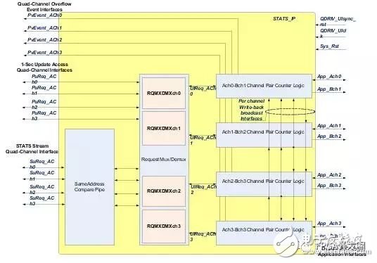 圖2中的STATS_IP架構(gòu)模塊圖標(biāo)出了三個(gè)子部件:每條通道的同地址比較管道(SACOMP)區(qū)塊、請求-復(fù)用-解復(fù)用(REQ_MXDMX_CHn)區(qū)塊以及每條QDR IV應(yīng)用通道1個(gè)的4個(gè)A-B通道配對(duì)計(jì)數(shù)器邏輯(ABCH_CTRL_CHn)區(qū)塊實(shí)例。