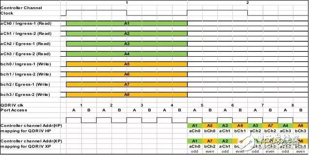 統(tǒng)計(jì)流四通道和一秒(處理器)更新四通道接口作為應(yīng)用通道。QDR IV控制器采用帶有為QDR IV端口A和端口B定義的專用四通道端口界面的4:1/1:4通道復(fù)用/解復(fù)用功能。QDR-IV控制器以固定順序?qū)νǖ肋M(jìn)行復(fù)用和解復(fù)用,應(yīng)用端和以4X時(shí)鐘頻率運(yùn)行的QDR IV設(shè)備端之間的順序?yàn)閏h0、ch1、ch2和ch3。圖3為所假設(shè)的QDR-IV控制器順序和建議的QDR IV HP統(tǒng)計(jì)計(jì)數(shù)器解決方案和QDR IV XP統(tǒng)計(jì)計(jì)數(shù)器解決方案應(yīng)用通道映射。