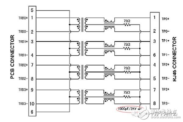 此外,常用的RJ45網(wǎng)口,為了減小EMI,常用到Bob-Smith電路,如下圖所示: