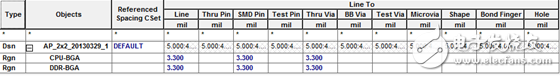 4. 還有一種可能需要的規(guī)則,就是區(qū)域規(guī)則。Allegro中默認(rèn)的線寬線距都是5mil,在CPU引腳比較密集的時(shí)候,這樣的規(guī)則是無(wú)法滿足的,這就需要在CPU或DDR芯片周圍設(shè)定允許小間距,小線寬的區(qū)域規(guī)則,如下圖: