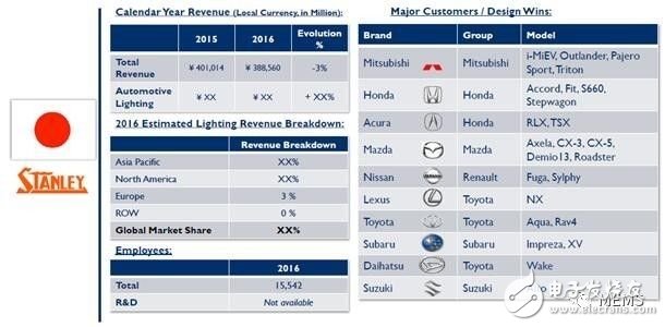 日本Stanley公司概覽及主要客戶(樣刊部分內(nèi)容未披露)為了保持領(lǐng)先地位,這些領(lǐng)導(dǎo)廠商不斷創(chuàng)新、開發(fā)新的技術(shù),包括集成OLED以及新型LED、LCD或激光光源。不過,這些領(lǐng)導(dǎo)廠商也面臨了其它廠商的競爭,例如印度的Varroc Lighting Systems以及奧地利的ZKW等,它們專注于利用激光器或OLED光源集成新的組件和技術(shù),開發(fā)新的照明系統(tǒng)、電路和(或)軟件。有些廠商的增長速度超過了市場平均增長速度。例如,日本的Ichikoh得益于被Valeo收購;中國的Xingyu(星宇)則獲益于中國汽車市場的快速增長,中國汽車市場預(yù)計將在未來五年迎來爆發(fā)性增長。亞洲,最主要是中國,代表了汽車市場的下一波機遇,該地區(qū)2017~2022年間的汽車銷售量預(yù)計將占全球總量的65%。本報告提供了全球汽車照明產(chǎn)業(yè)的市場分析,并從總體及按地區(qū)詳細提供了前15位供應(yīng)商的營收和市場份額。本報告還特別重點關(guān)注了中國汽車照明市場和產(chǎn)業(yè)。