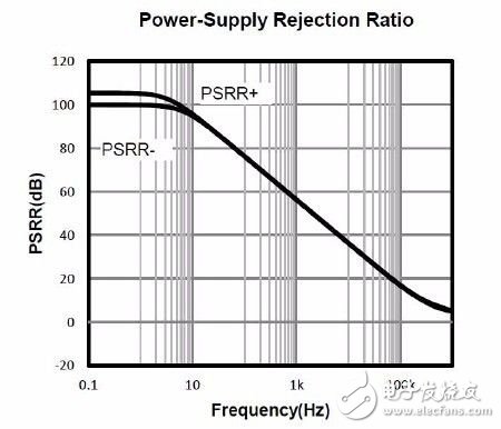 此外需考慮運放的電源抑制比。電源上的噪聲會隨著每個有源器件的電源引腳傳導到信號通路中,作為ADC 驅動放大器的運放,其自身的電源抑制比若不能抑制這些噪聲的話,噪聲就會疊加到運放的輸出中。特別是電路中采用了開關電源供電時,電源上會有高頻尖峰電壓噪聲,而運放的電源抑制比在高頻時通常下降得厲害,對它們沒有抑制作用。以標準電路圖中所用的運放LMV358A 為例,其電源抑制比詳見圖2.15。