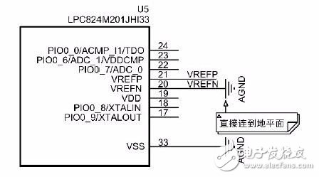 線性穩(wěn)壓器U2 應該靠近LPC82x 放置,其他數字電路不共用MCU 的3.3V 電源,如果考慮成本需要共用,數字部分電源單獨用LC 濾波電路隔離。