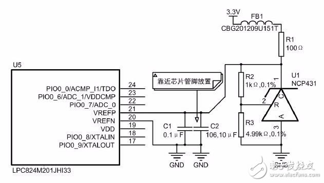 其中,C2、C1 是內部ADC 參考源管腳的儲能電容,R2、R3 用于設定參考源芯片NCP431的輸出電壓,R1 用于設定NCP431 的靜態(tài)工作電流,磁珠FB1 與R1 串聯,與C2 形成低通濾波器,濾除基準源供電3.3V 上可能存在的高頻干擾。